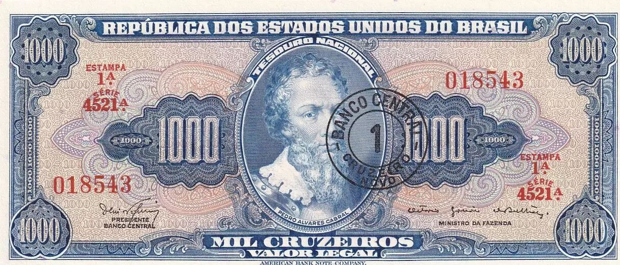Home > World Banknotes > American Banknotes > Brazil > Brazil 1 Cruzeiro Novo on 1000 Cruzeiros, Pedro Alvares Cabral - 1967