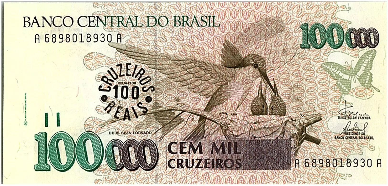 Banknote Brazil 100 Cruzeiros reais on 100000 Cruzeiros, Oiseaux - 1993