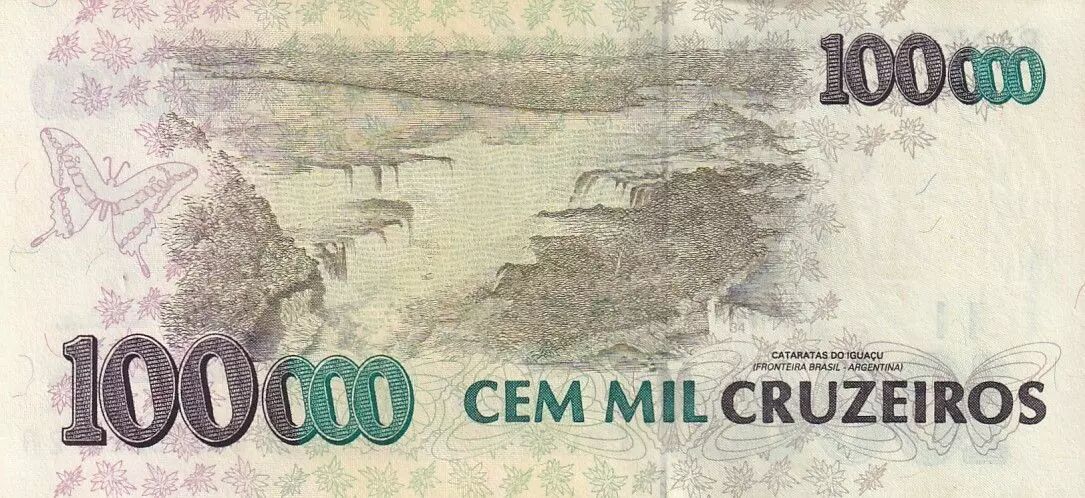 The reverse of the banknote offers a panoramic view of the Iguazu Falls, a natural site located on the border between Brazil and Argentina. This image highlights the natural beauty of Brazil and its geographical position in South America. The nominal value, "CEM MIL CRUZEIROS", is repeated. The inscription "CATARATAS DO IGUAÇU (FRONTEIRA BRASIL / ARGENTINA)" clearly identifies the place represented.