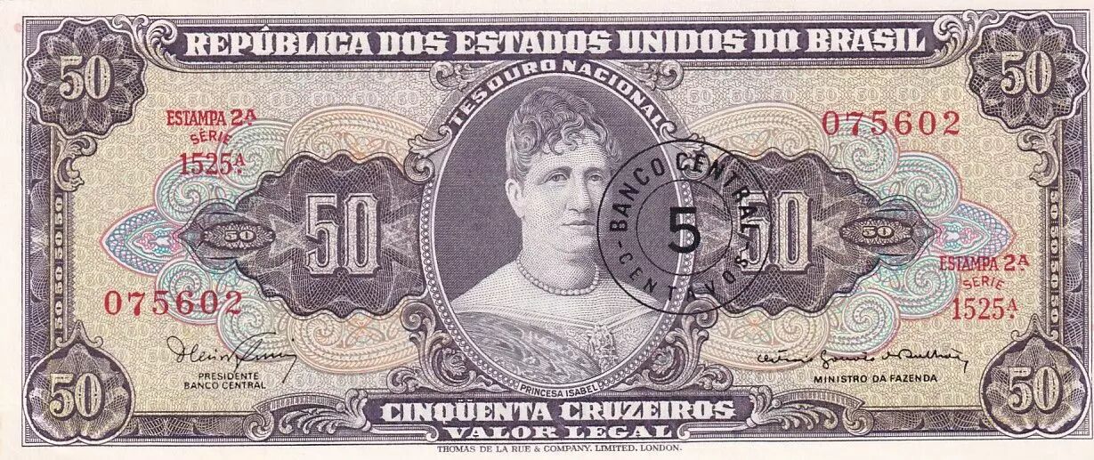 The textual inscriptions include "REPÚBLICA DOS ESTADOS UNIDOS DO BRASIL" and "CINQÜENTA CRUZEIROS". Also found are the mentions "TESOURO NACIONAL", "BANCO CENTRAL", "PRINCESA ISABEL", as well as the functions "DIRETOR", "CAIXA DE AMORTIZAÇÃO", and "MINISTRO DA FAZENDA". The mention "VALOR LEGAL" is also present. The printer, Thomas de la Rue & Company, Limited, London, is mentioned.