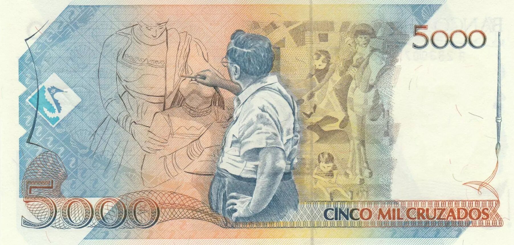 The 5 novos cruzados banknote, issued in 1989, pays tribute to Candido Portinari, an emblematic figure in Brazilian art. This banknote is part of the A-283 series.