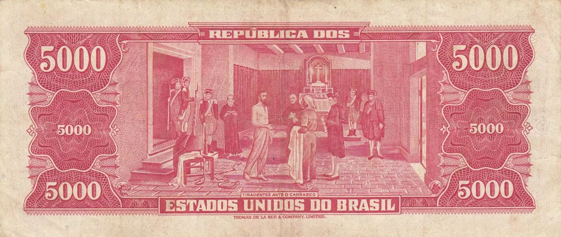 The obverse of the banknote features a dominant solferino red color, produced using polychrome chalcography and offset techniques. An oval medallion, positioned on the right, highlights the portrait of Joaquim José da Silva Xavier, better known as Tiradentes (1746-1792). The inscription "REPÚBLICA DOS ESTADOS UNIDOS DO BRASIL" is printed above the medallion, while the inscription "CINCO MIL CRUZEIROS / VALOR LEGAL" is placed below. On the left side of the banknote are the print number, the serial number (at the top) and the order number (in the center), as well as the signature of the director of the Amortization Fund. On the right, there is the order number (at the top), the print number, the serial number (in the center) and the signature of the Minister of Finance (at the bottom). The name of the printer, THOMAS DE LA REU & COMPANY, LIMITED, is also mentioned.