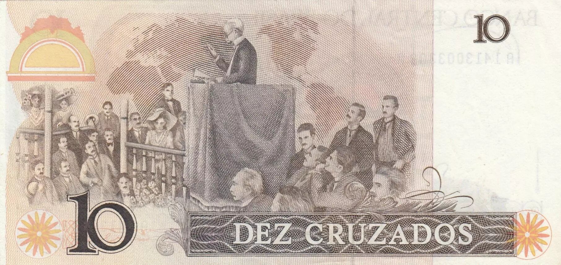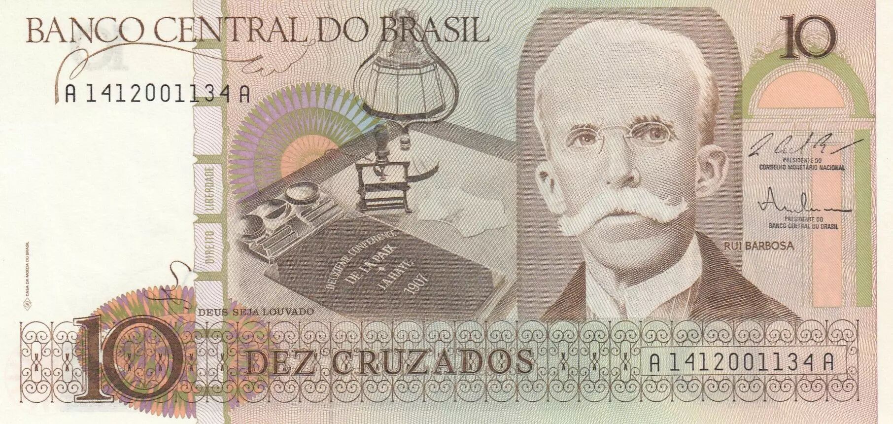 Plusieurs inscriptions figurent également sur le recto : "BANCO CENTRAL DO BRASIL", "PRESIDENTE DO CONSELHO MONETÁRIO NACIONAL", "PRESIDENTE DO BANCO CENTRAL DO BRASIL", "RUI BARBOSA", "DIREITO LIBERDADE", "DEUXIÈME CONFÉRENCE DE LA PAIX LAHAYE 1907", "10 DEZ CRUZADOS" et "CASA DA MOEDA DO BRASIL".