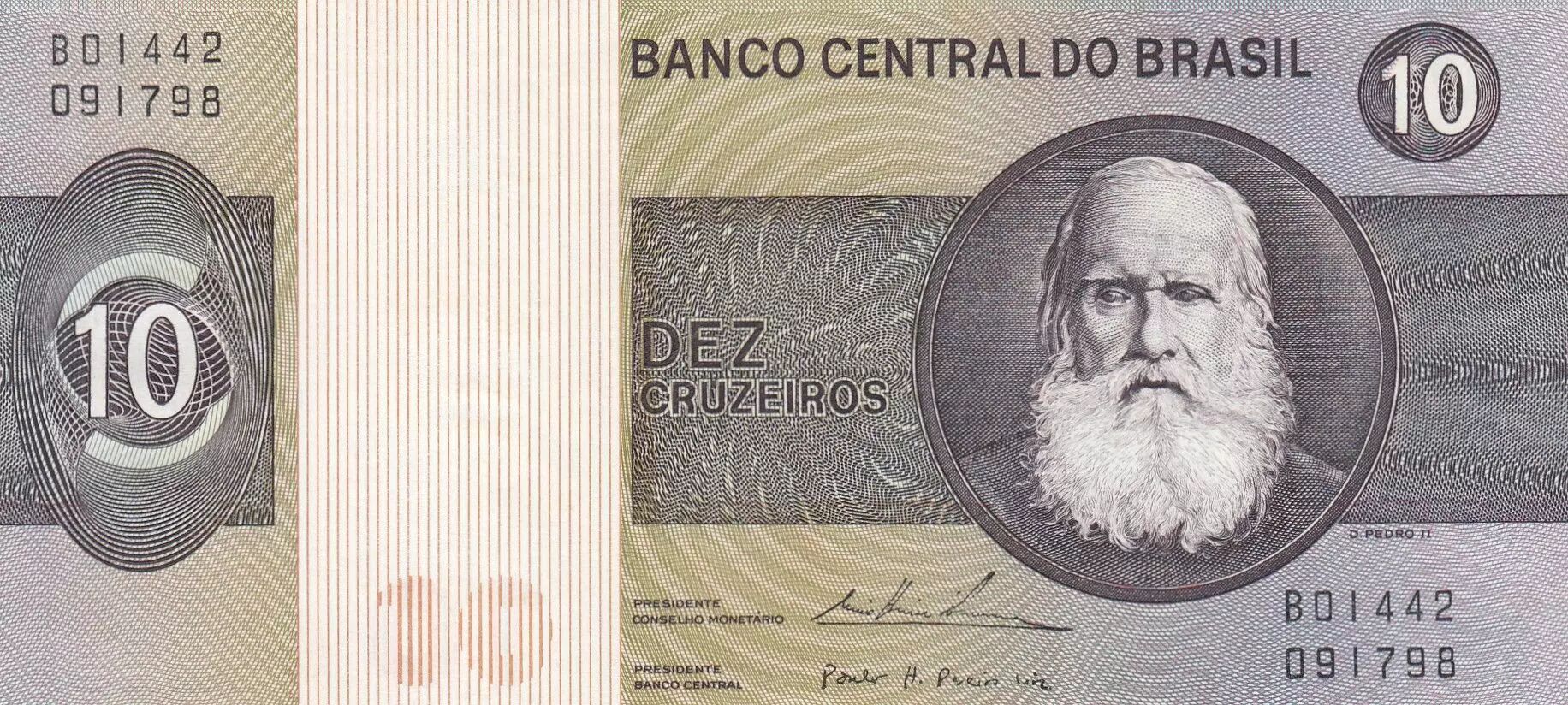 Ce billet de banque de 10 cruzeiros brésiliens, émis en 1974, fait partie de la Série B. Il a été conçu par Aloísio Sérgio Barbosa de Magalhães.