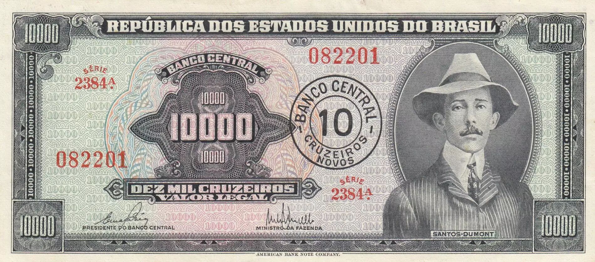 Sur le recto du billet, on peut voir le portrait d'Alberto Santos Dumont (1873-1932) sur la partie droite. Au-dessus du portrait, on trouve la mention "REPÚBLICA DOS ESTADOS UNIDOS DO BRASIL". En dessous, l'inscription "DEZ MIL CRUZEIROS / VALOR LEGAL" indique la valeur nominale du billet, surmontée de la valeur en chiffres et de l'inscription "BANCO CENTRAL". Le numéro de série est situé en haut à gauche, suivi du numéro de séquence au centre et de la signature du Presidente de la Banque centrale en bas. À droite, on retrouve le numéro de séquence en haut, le numéro de série au centre et la signature du ministre des Finances en bas.