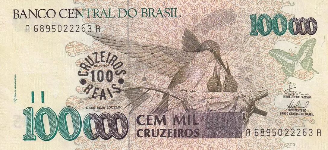 Au recto, le billet présente une scène naturaliste mettant en scène un colibri à poitrine bleue (Amazilia lactea) nourrissant ses oisillons dans un nid. Cette représentation symbolise la faune brésilienne. On y trouve également un timbre rond indiquant la valeur de 100 Cruzeiros Reais. Les inscriptions incluent le nom de l'institution émettrice, "BANCO CENTRAL DO BRASIL", ainsi que la valeur nominale en toutes lettres, "CEM MIL CRUZEIROS". La mention "DEUS SEJA LOUVADO" (Dieu soit loué) est également présente, ainsi que les signatures du Ministre de la Fazenda et du Président du Banco Central do Brasil.