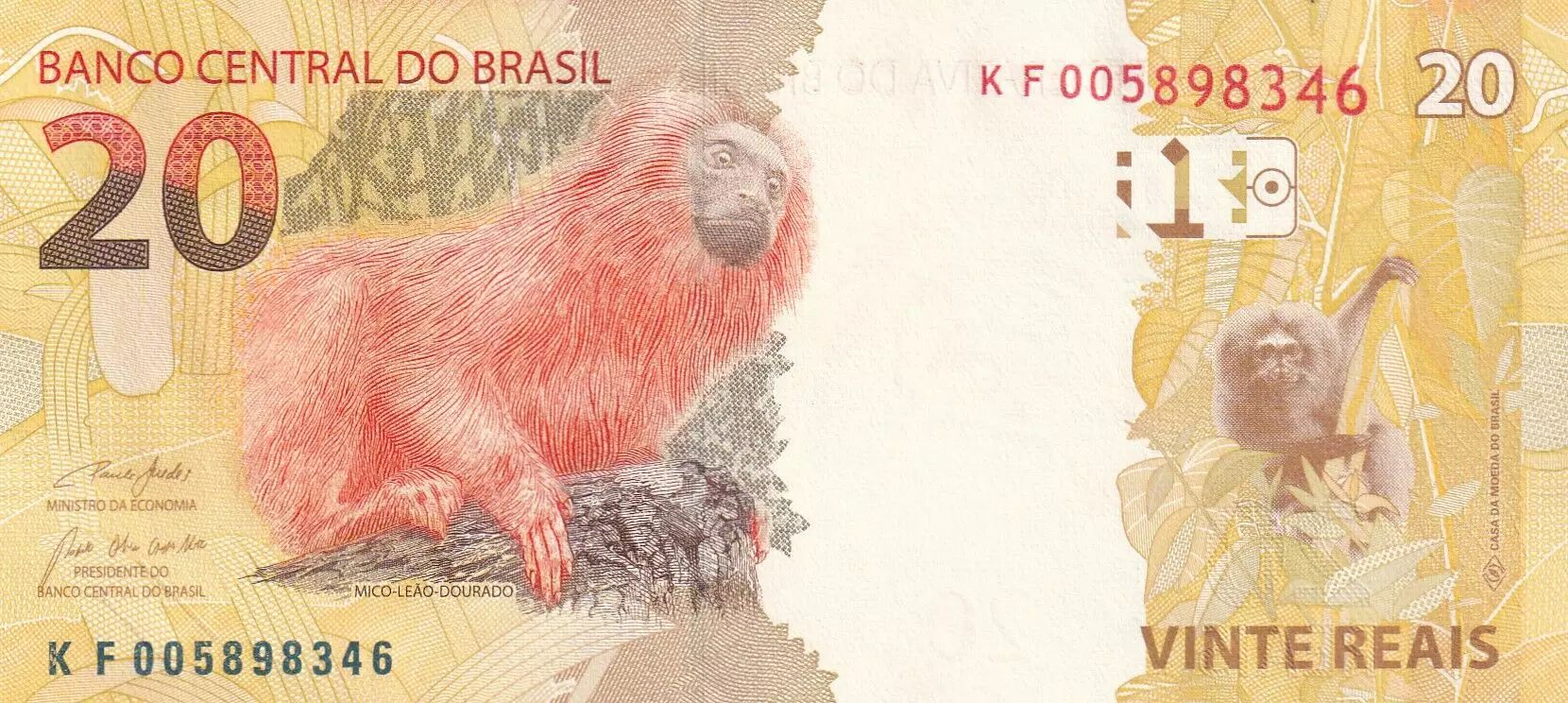 Accueil > Archivage > archivage-Billets du Monde > Brésil 20 Reais Liberté - Singe Mico-Leao Dourado 2010 (2023) - Série KC