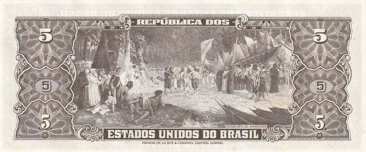Le verso du billet, imprimé en sépia par calchographie, représente la Conquista do Amazonas, une peinture d'Antonio Parreiras. Cette image est située au centre du billet. Les inscriptions incluent "REPÚBLICA DOS", "CONQUISTA DO AMAZONAS", et "ESTADOS UNIDOS DO BRASIL". La valeur faciale, 5, est répétée à plusieurs endroits. Thomas de la Rue & Company, Limited, London, est également mentionné au verso.