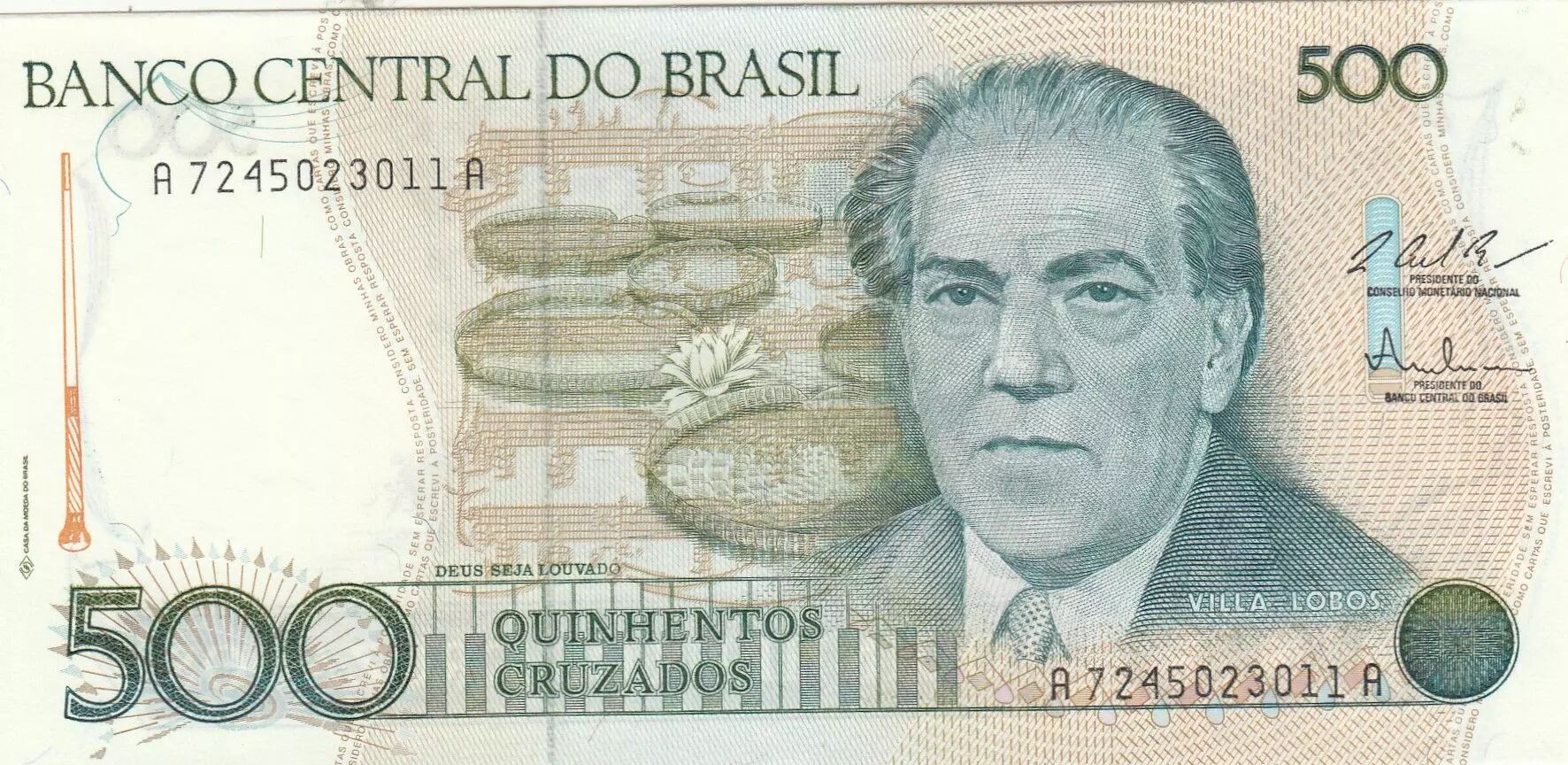 Les inscriptions présentes sur le recto incluent "BANCO CENTRAL DO BRASIL 500", ainsi que les titres du "PRESIDENTE DO CONSELHO MONETÁRIO NACIONAL" et du "PRESIDENTE DO BANCO CENTRAL DO BRASIL". On y trouve également la mention "CASA DA MOEDA DO BRASIL" et la devise "DEUS SEJA LOUVADO". Le nom "VILLA LOBOS" est mis en évidence, accompagné de la valeur nominale "500 QUINHENTOS CRUZADOS".