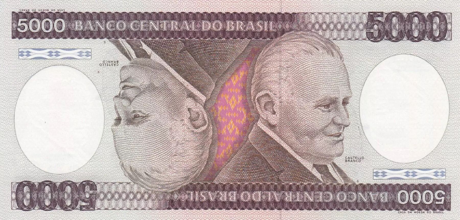 Sur le recto du billet, on retrouve une composition symétrique avec deux images identiques et inversées disposées verticalement. Au centre de cette composition, le portrait de Castelo Branco est mis en évidence. Les inscriptions incluent la valeur nominale "5000" répétée, le nom de l'institution émettrice "BANCO CENTRAL DO BRASIL", et le nom du personnage honoré "CASTELO BRANCO". La mention "CASA DA MOEDA DO BRASIL" indique l'établissement responsable de la frappe du billet. Le graveur de cette face est José Maria das Neves, tandis que le dessinateur est Aloísio Sérgio Barbosa de Magalhães. Toutes les inscriptions sont rédigées en alphabet latin.