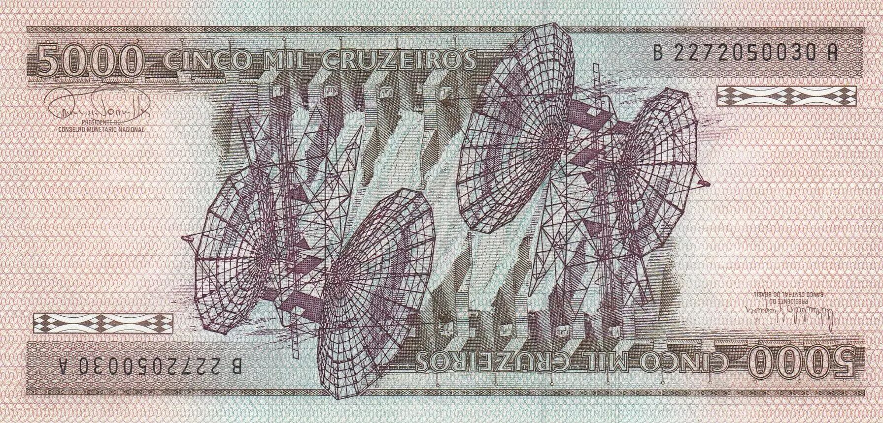 Le verso du billet présente également une structure symétrique avec deux images similaires inversées verticalement. L'élément central de cette face est une représentation picturale d'un barrage hydroélectrique, symbolisant la production d'énergie. Cette image est superposée à des antennes paraboliques, évoquant le secteur des télécommunications. L'ensemble de ces éléments visuels met en lumière les avancées technologiques et infrastructurelles du Brésil à cette époque.