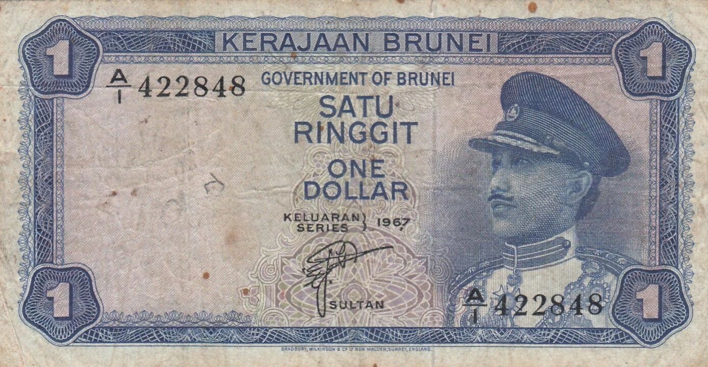 Voici une description numismatique du billet de 1 Ringgit du Brunei, émis en 1967 :