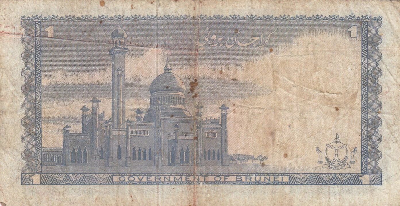 Le verso du billet présente une vue de la mosquée Omar Ali Saifuddien, un édifice emblématique du Brunei. Les armoiries du Brunei sont également représentées. La valeur nominale « SATU RINGGIT » est inscrite en toutes lettres. Des ornements et des motifs locaux ornent également le verso.
