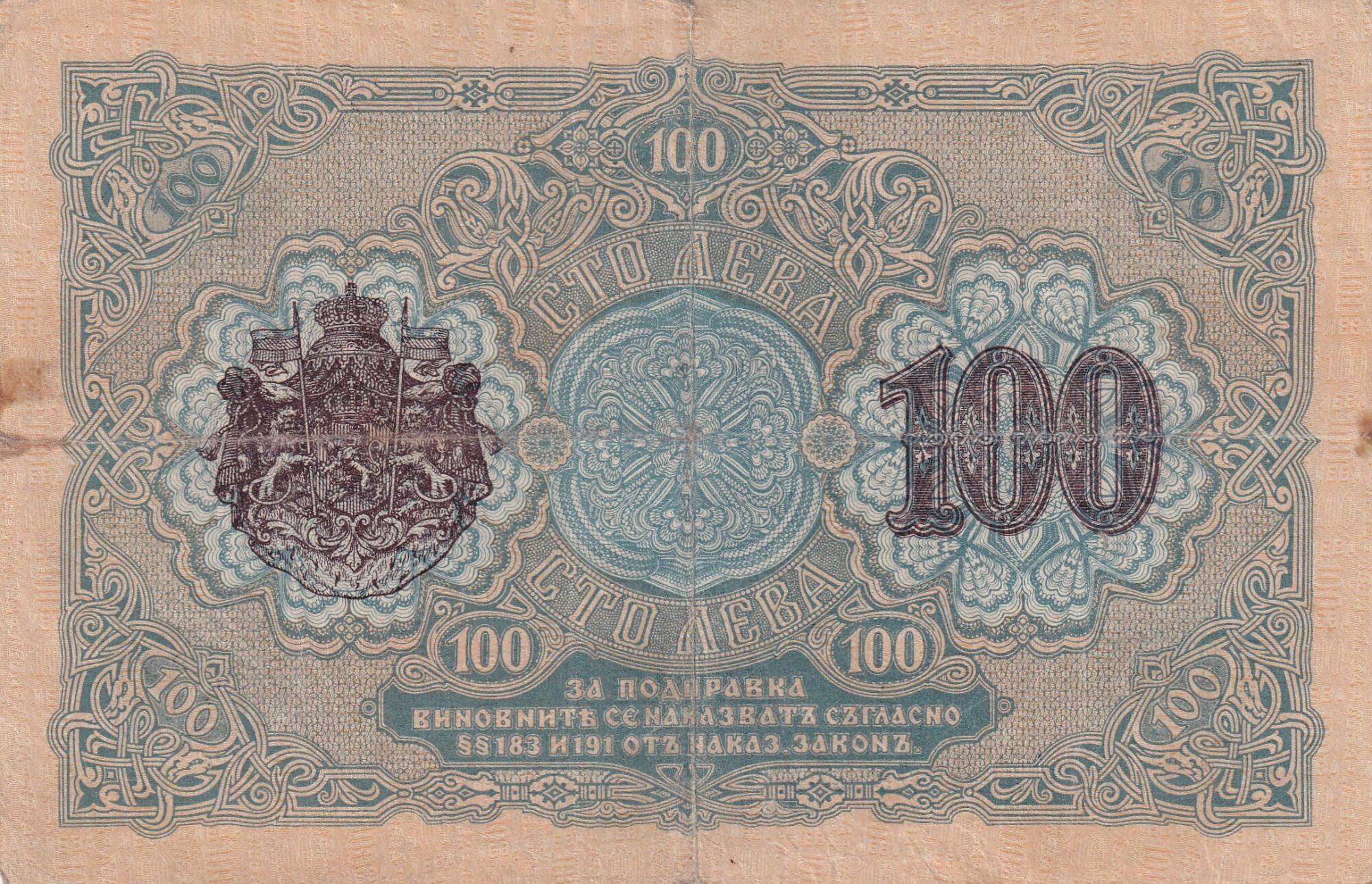 This banknote was issued by Bulgaria in 1916. Its face value is 100 leva zlato.