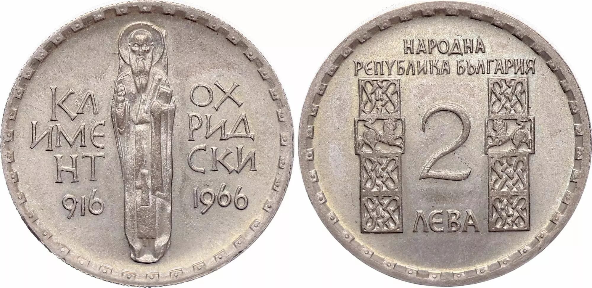Pièce Bulgarie 2 Leva - 1050ème Anniversaire de la mort de Ochridsky - 1966