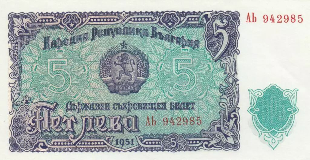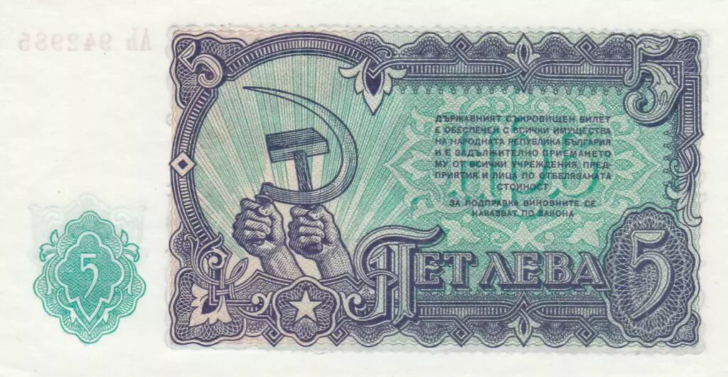 Accueil > Billets du Monde > Billets d'Europe > Bulgarie > Bulgarie 5 Leva 1951 - Faucille et marteau
