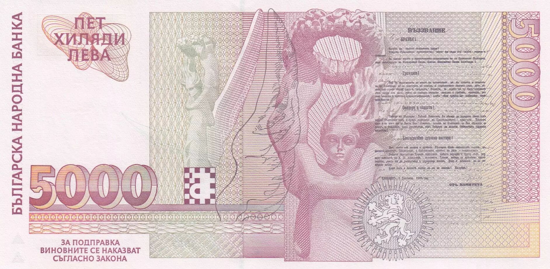 Ce billet de banque a été émis par la Banque Nationale Bulgare en 1997. Il possède une valeur nominale de 5000 leva.