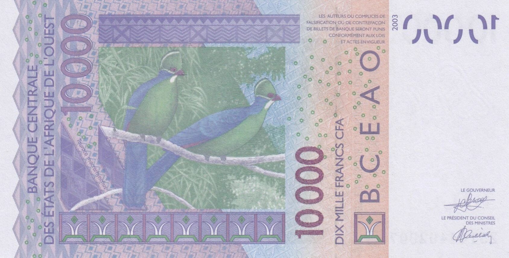 Ce billet de banque est émis par le Burkina Faso en 2003. Sa valeur nominale est de 10000 francs.