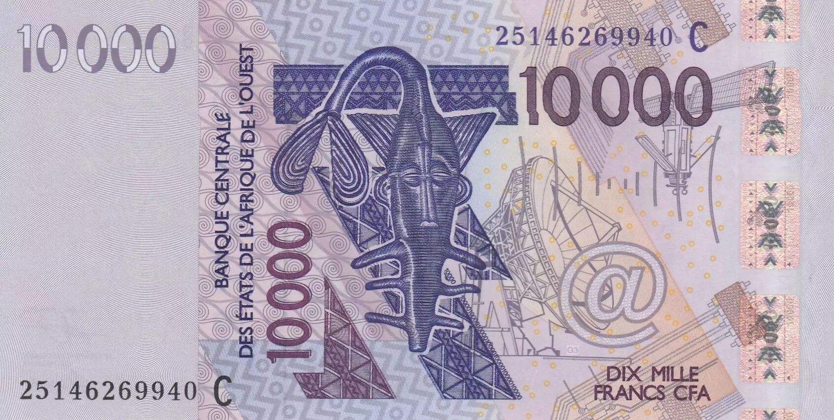 Le recto du billet présente un masque stylisé, élément central de la composition, évoquant l'art et la culture du Burkina Faso. Des motifs géométriques complexes et des figures d'oiseaux stylisés ornent également le recto, témoignant de la richesse de l'iconographie traditionnelle burkinabé. La couleur dominante de cette face est une combinaison de tons ocre et de nuances terreuses, rehaussée par des touches de couleurs vives dans les motifs décoratifs. La valeur nominale, « 10000 », est clairement indiquée en chiffres dans un coin du billet.