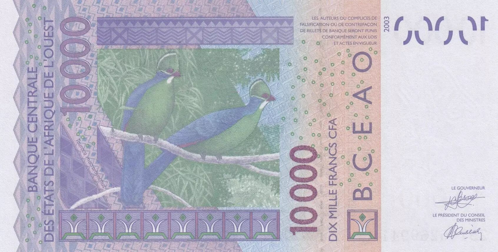 Ce billet de banque est émis par le Burkina Faso en 2003. Sa valeur nominale est de 10000 francs.