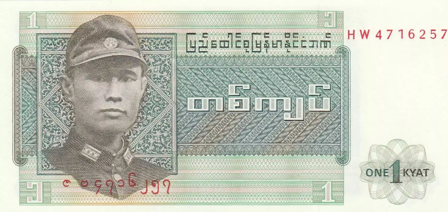 The 1 Kyat Burmese banknote, issued in 1972, features distinct visual characteristics on both sides. The front of the note showcases a portrait of General Aung San, a major historical figure in Burma. He is depicted wearing a Japanese army uniform and a cap. The legend "Union Bank of Burma" is inscribed in Burmese.
