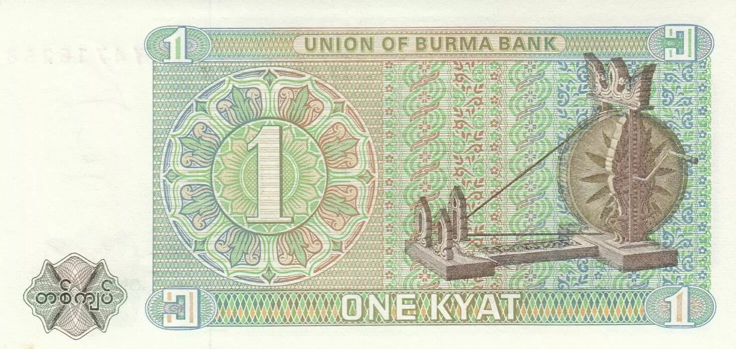 On the back, the banknote features a central motif consisting of an ornamental circle containing the number "1" in English characters, positioned on the left. On the right, a textile spinning wheel is depicted, evoking the country's traditional industry. The inscriptions are written in Burmese, highlighting national identity. The face value "One Kyat" is also mentioned.