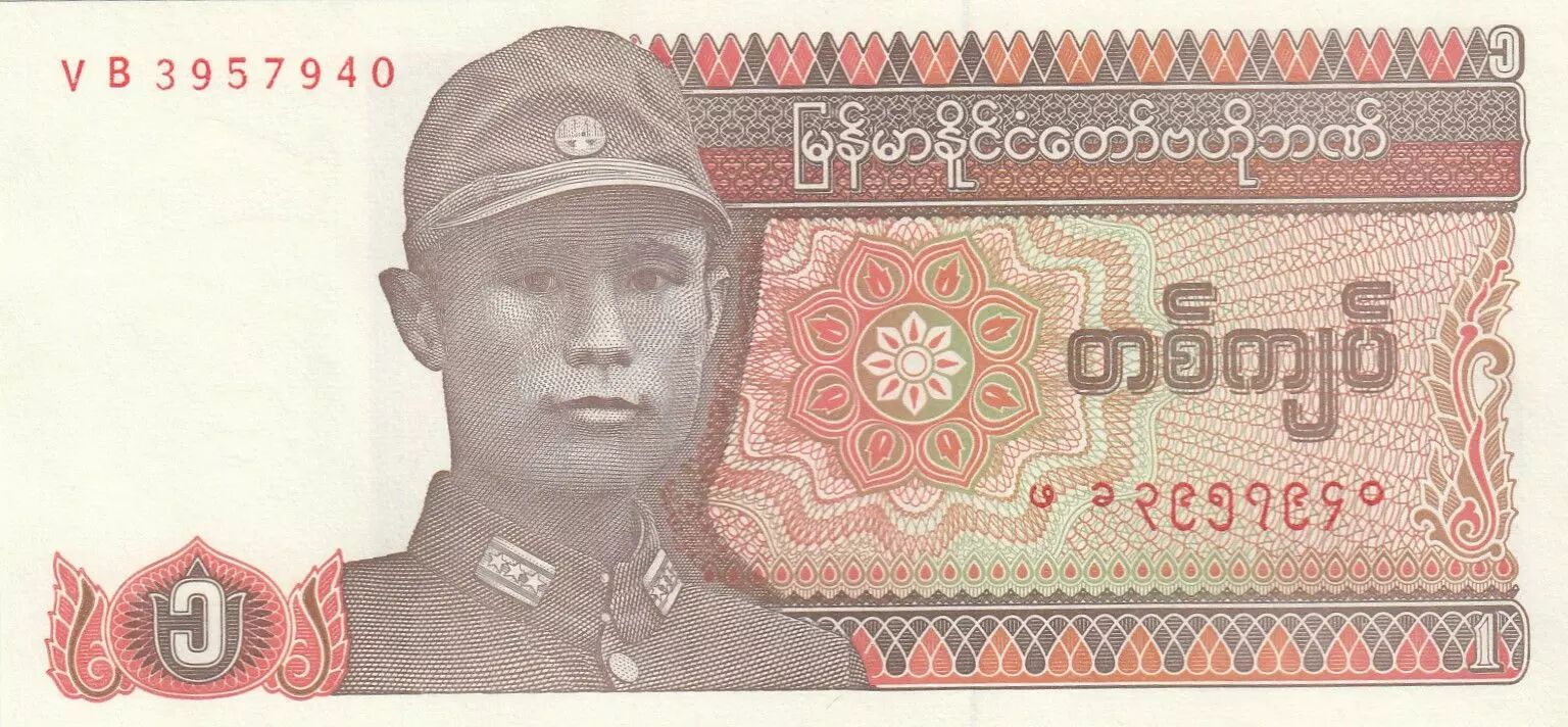 This banknote, with a face value of 1 kyat, was issued in Burma in 1990. It belongs to the VB series and was produced by the Central Bank of Myanmar.