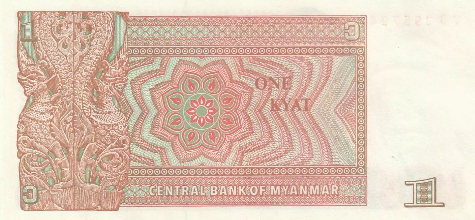 The back of the banknote features a wooden sculpture depicting two dragons. It also includes the inscriptions "ONE KYAT" and "CENTRAL BANK OF MYANMAR 1", indicating the value and issuing institution.