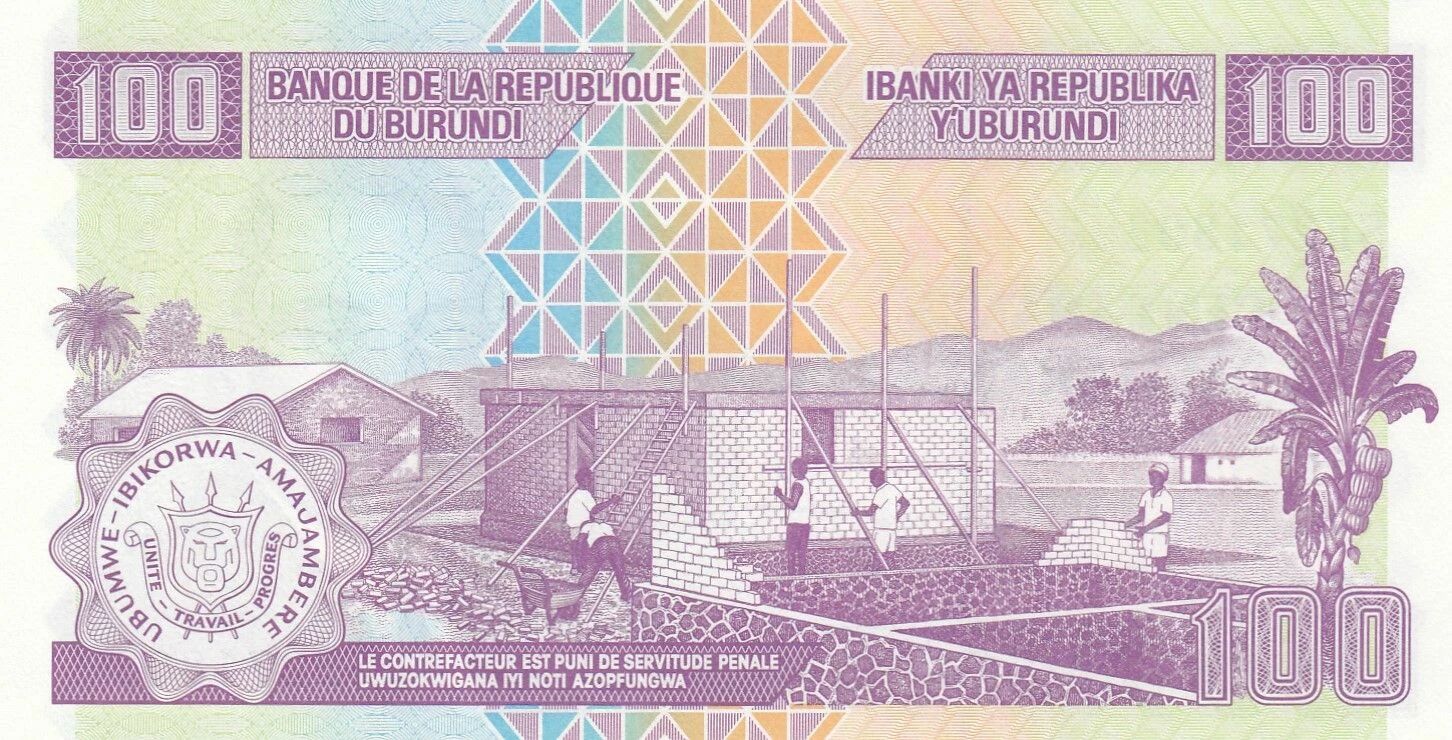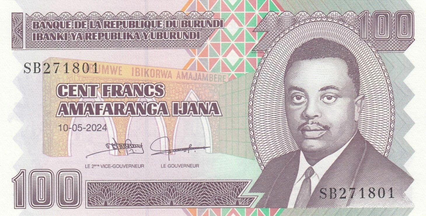 Ce billet de banque est émis par le Burundi et possède une valeur faciale de 100 francs. Il date de l'année 2024 et appartient à une série identifiée par les lettres "SB".