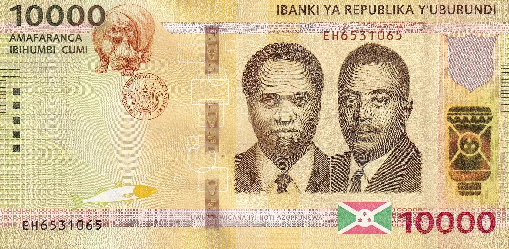 Home > World Banknotes > African Banknotes > Burundi > Burundi 10000 Francs - Presidents, hippo - Map of Burundi - 2018 - Serial EH - P.54b