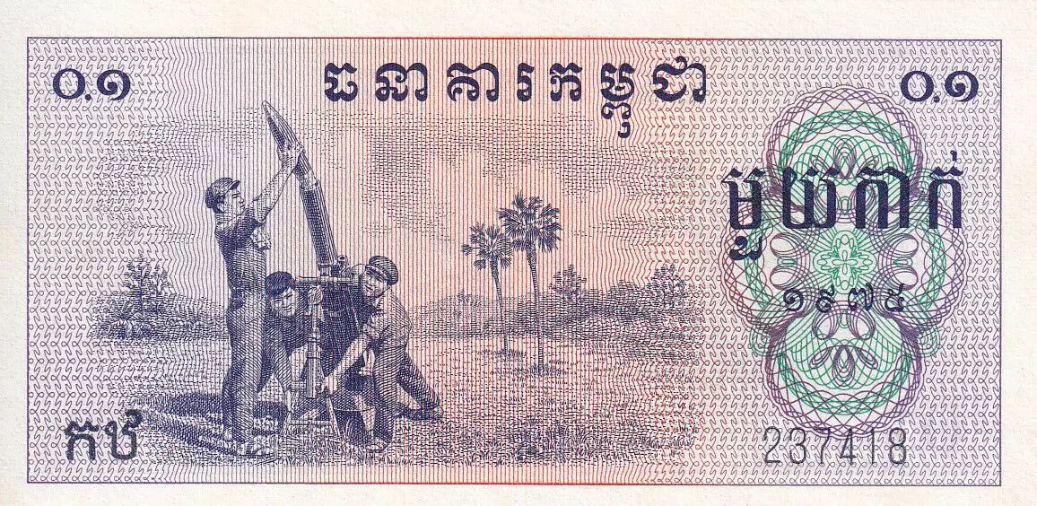 Accueil > Archivage > Cambodge 0.1 Riels (1 kak) - Soldats - 1975 - P.18a