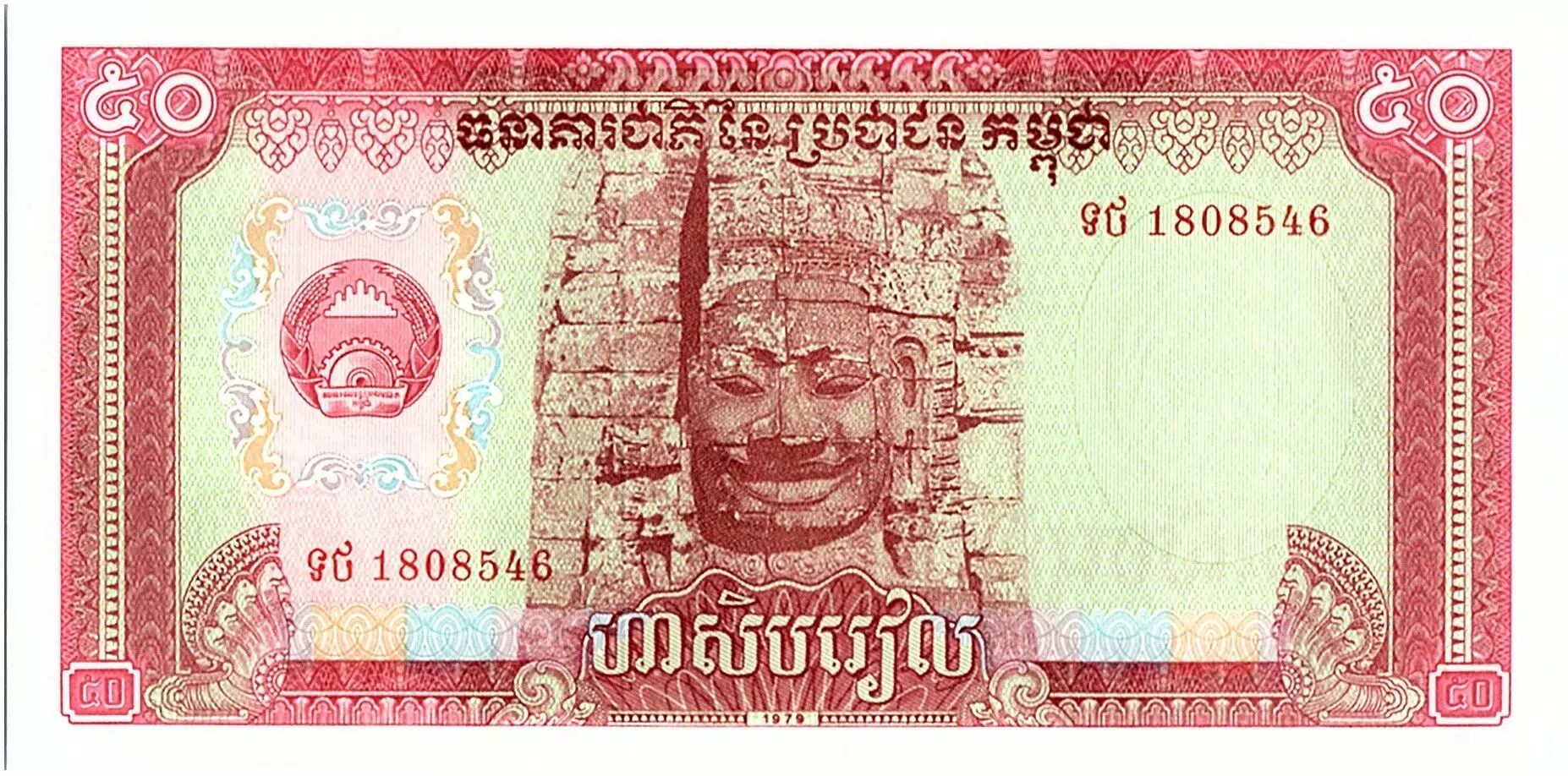 Banknote Cambodia 50 Riels, Bayon stone head - View of Angkor - 1979 - P.32 a