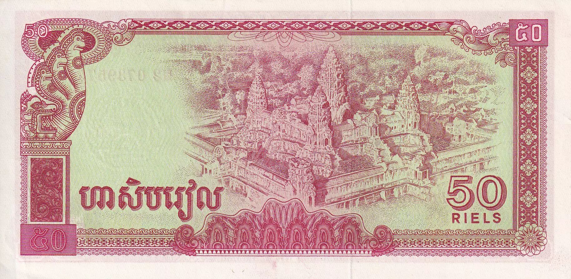 Banknote Cambodia 50 Riels - Bayon stone head - View of Angkor - 1979 - P.32 a
