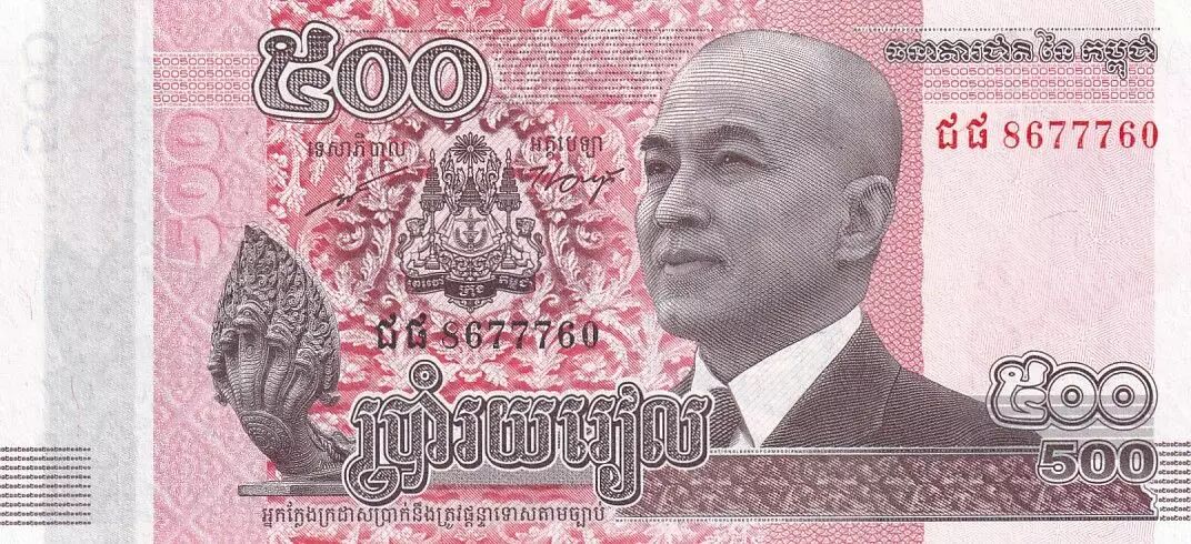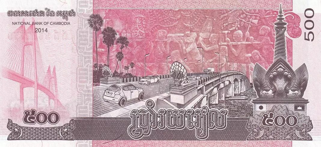 The 500 Riel banknote issued in 2014 by the National Bank of Cambodia. Its monetary unit is the riel.