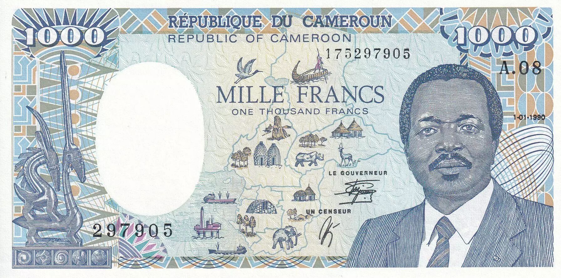Home > > Cameroon 1000 Francs Map of CAS (completed) - 1990 - Serial A.08 - UNC - P.26b