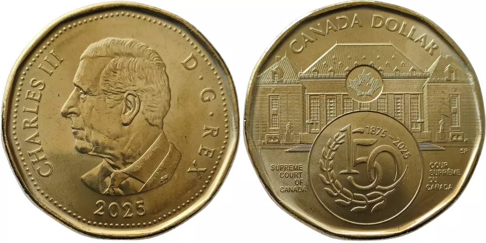 This Canadian commemorative coin with a face value of 1 dollar was minted in 2025 to celebrate the 150th anniversary of the Supreme Court of Canada. It is made of steel and weighs 6.27 grams, with a diameter of 26.5 millimeters.