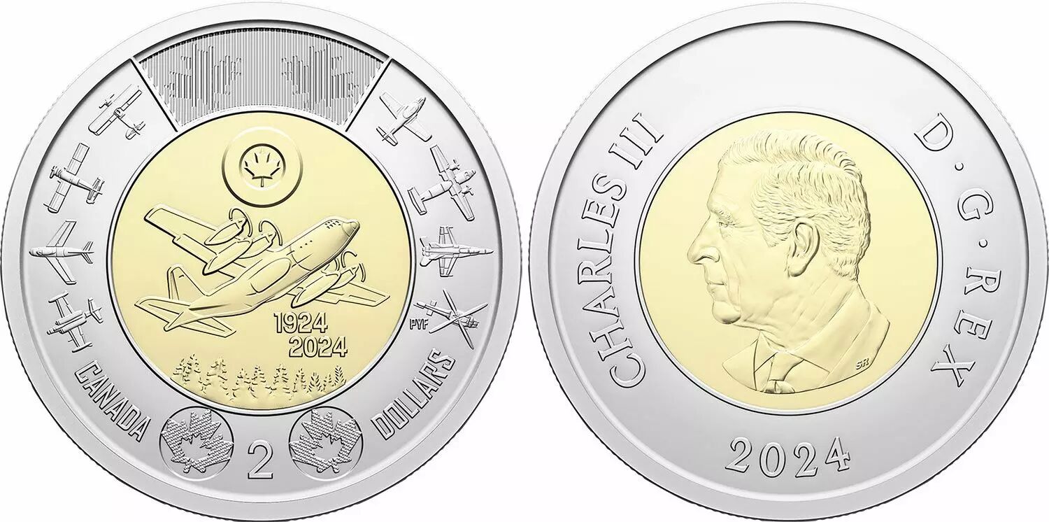 La pièce de 2 dollars du Canada frappée en 2024 pour commémorer le 100e anniversaire de l'Aviation royale canadienne est une pièce bimétallique d'une grande élégance, célébrant un siècle d'excellence et d'innovation dans le domaine de l'aviation militaire canadienne. À la fois moderne et symbolique, cette pièce rend hommage à l'héritage de l'Aviation royale canadienne (ARC), un pilier important de la défense du pays et de son histoire aérienne.