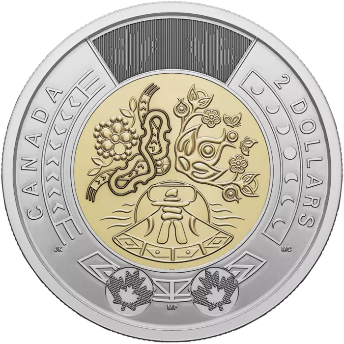 La pièce de circulation commémorative de 2 dollars de la Journée nationale des peuples autochtones 2023 célèbre l'art et les cultures des Premières nations, des Inuits et des Métis. Le dessin est gravé par trois artistes, qui ont réuni leurs expressions individuelles pour former une ode puissante aux cultures et aux patrimoines des Premières nations, des Inuits et des Métis.
