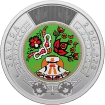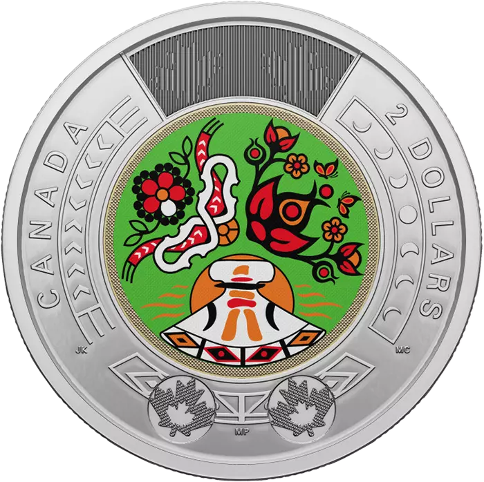 La pièce de circulation commémorative de 2 dollars de la Journée nationale des peuples autochtones 2023 célèbre l'art et les cultures des Premières nations, des Inuits et des Métis. Le dessin est gravé par trois artistes, qui ont réuni leurs expressions individuelles pour former une ode puissante aux cultures et aux patrimoines des Premières nations, des Inuits et des Métis.
