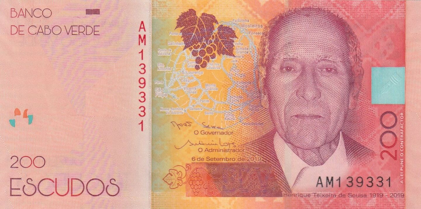 The front of the banknote features the figure of Henrique Teixeira de Sousa. His portrait is intaglio printed and superimposed on a medallion reproducing a piece of pano di terra and the map of Fogo Island. The lower part of the banknote is made in offset and features a lithographic microtext that is not visible to the naked eye. A watermark, also representing Henrique Teixeira de Sousa and measuring approximately 25.3 mm in height, is integrated on the left side of the banknote, covering approximately one third of its surface. The signatures of the Governor and Administrator of the Bank of Cape Verde are affixed to the left of the portrait, just below the map of Fogo Island. On the same map, a bunch of grapes from the Chã das Caldeiras region is printed in intaglio, with the inscription BCV in microtext.