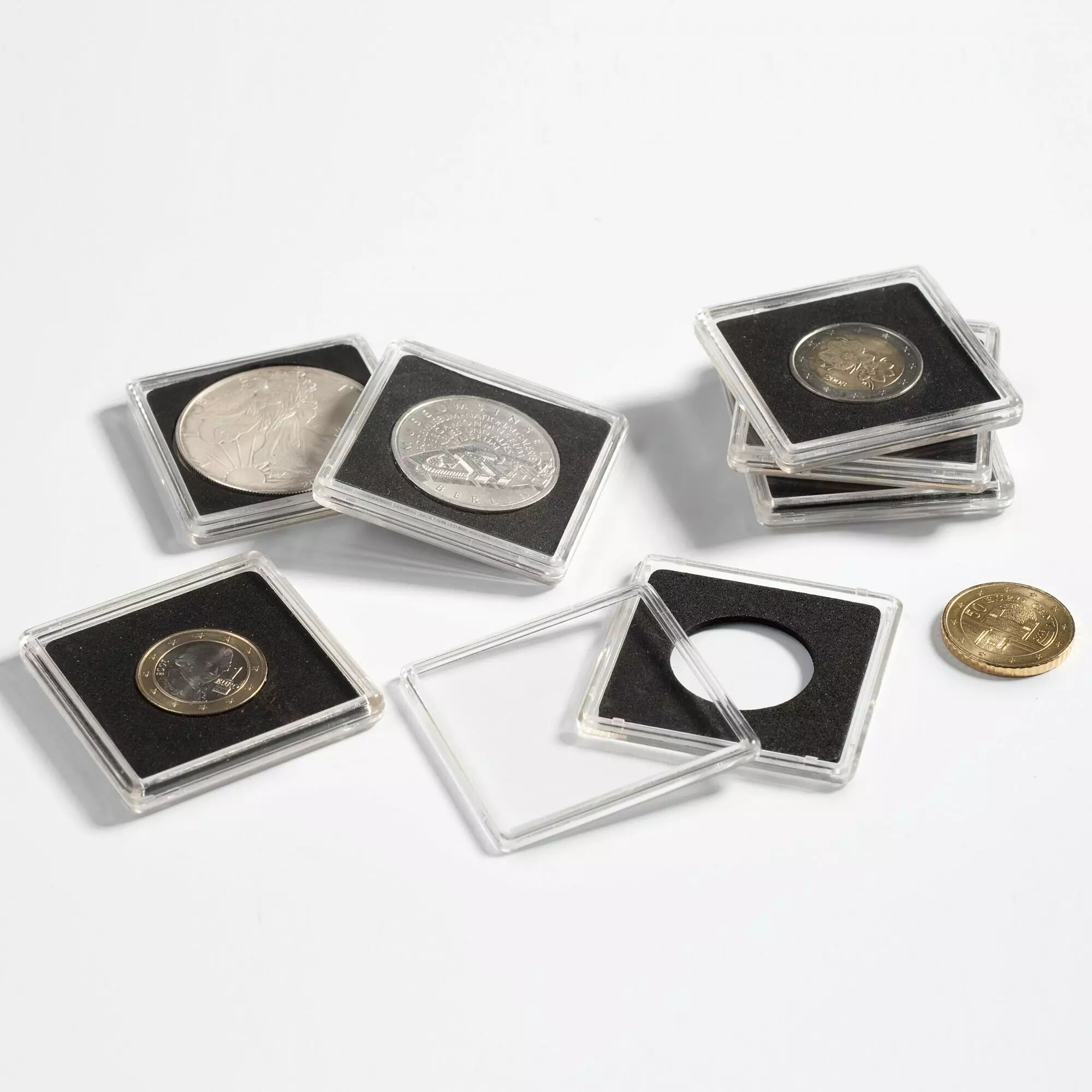 Capsules carrées en plastique de haute qualité et résistant aux rayures. Le couvercle est très facile à saisir et à ouvrir. Les capsules sont livrées avec une insertion noire qui permet de loger les pièces ayant un diamètre de 37 mm.