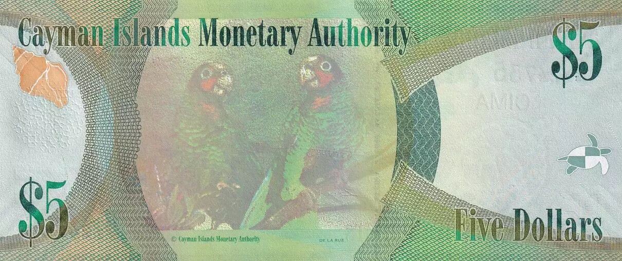 On the back of the bill, a pair of Cayman Islands parrots is depicted in the center, accompanied by a conch shell on the right. The denominations are repeated in opposite corners. The Latin inscriptions again include the name of the monetary authority, the face value of five dollars, and the copyright symbol. The mention "DE LA RUE" is also present.