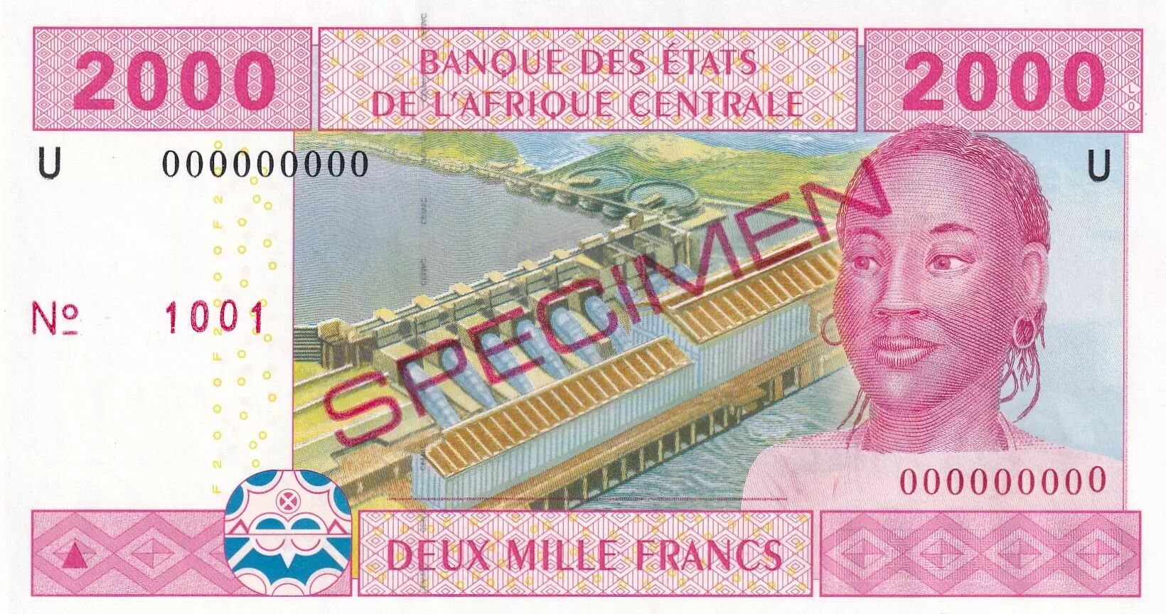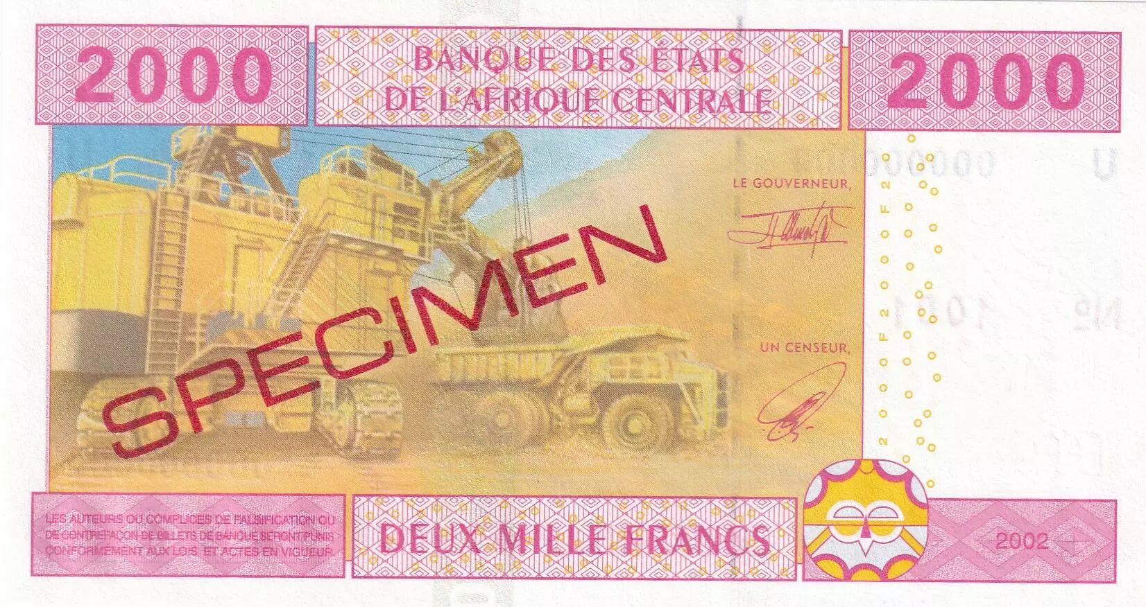 Banknote Central African States 2000 Francs 2002 - Young lady, dam, mining - U = Cameroon - Specimen