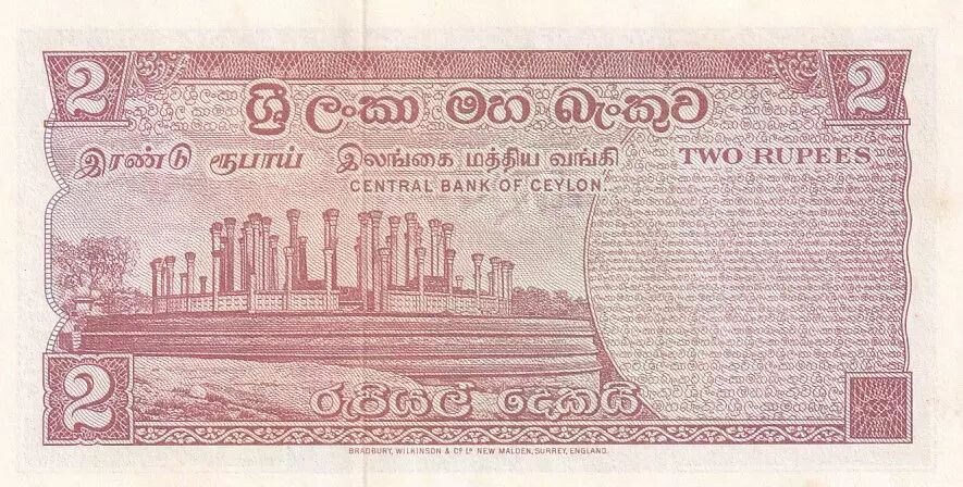 Ce billet de 2 roupies émis en 1973 à Ceylan (aujourd?hui Sri Lanka) présente sur le recto le roi Parakramabahu, souverain historique emblématique du pays, accompagné des inscriptions de la banque centrale et de la valeur faciale en latin et en langue locale (cinghalais ou tamoul). Le verso illustre généralement des motifs culturels ou architecturaux typiques de Ceylan, reflétant le patrimoine national. Ce billet combine hommage historique et éléments de sécurité classiques pour l?époque, tout en servant de moyen légal de paiement.