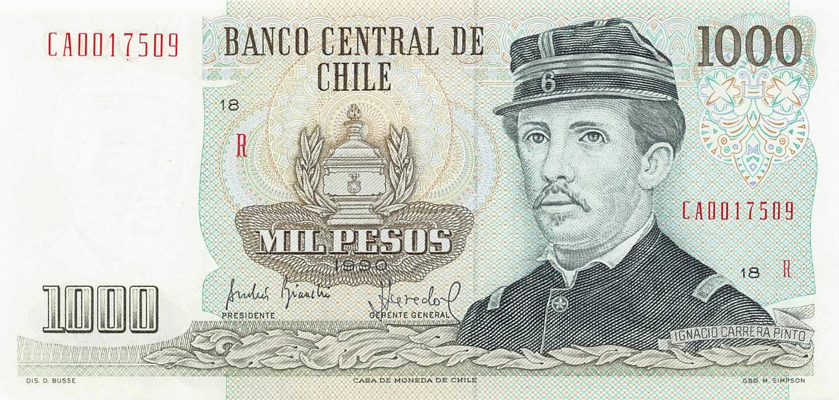 Home > World Banknotes > American Banknotes > Chile > Chile 1000 Pesos - I. Carrera Pinto - 1990 - P.154