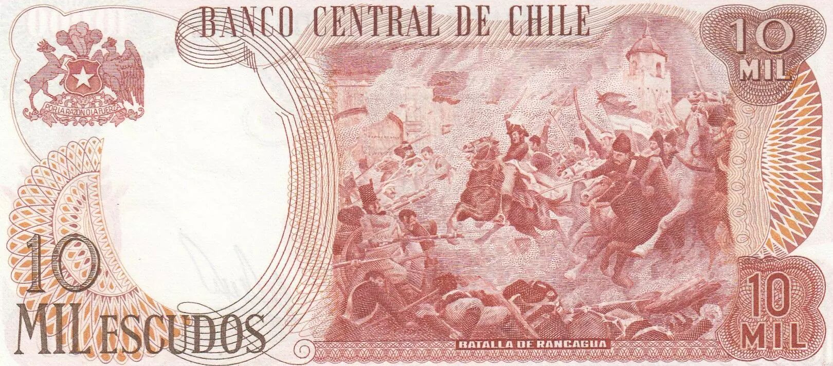 The 10,000 Chilean escudo banknote issued in 1976, series A24, commemorates O'Higgins and the Battle of Rancagua. O'Higgins' presence on the banknote testifies to his importance in Chilean history. The mention of the Battle of Rancagua recalls a key event in Chilean independence. The escudo was the currency in use in Chile at that time, before being replaced by the Chilean peso. This banknote constitutes a historical and numismatic testimony of this period of Chilean history.