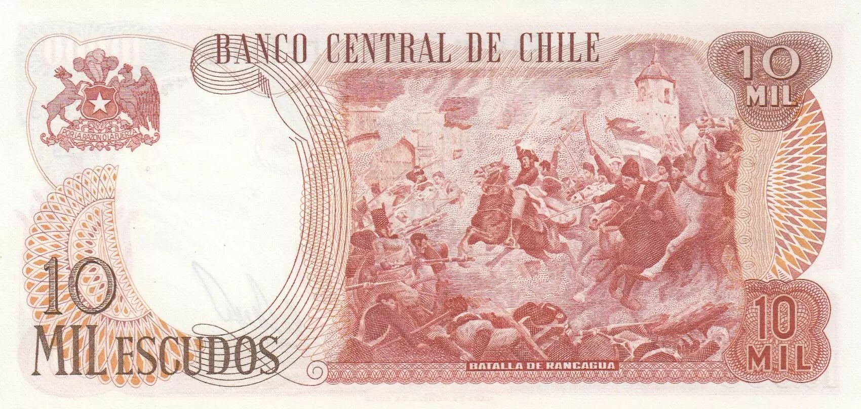 Au verso du billet, une représentation de la Bataille de Rancagua est illustrée. Cette bataille est un événement clé de l'histoire chilienne, et son inclusion sur le billet souligne son importance culturelle et historique. Des éléments de paysage ou des symboles nationaux peuvent également être incorporés dans le dessin. Comme pour le recto, des inscriptions en espagnol, potentiellement des informations légales ou des détails sur la bataille, sont visibles. Les couleurs et le style artistique du verso sont conçus pour compléter le recto et renforcer l'authenticité du billet.