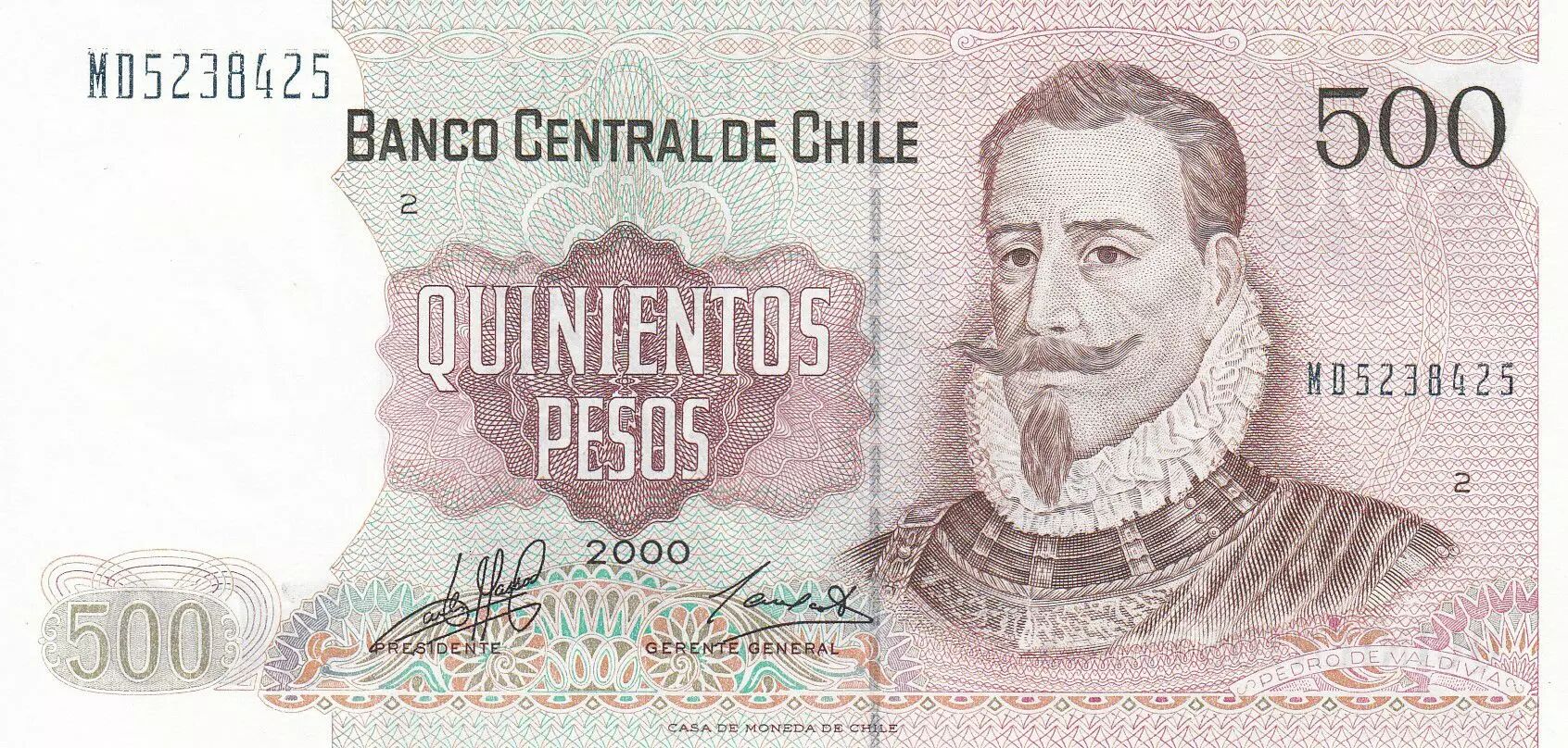 Accueil > Billets du Monde > Billets d'Amérique > Chili > Chili 500 Pesos - Pedro de Valdivia - Foundation de Santiago - 2000 - Neuf - P.53