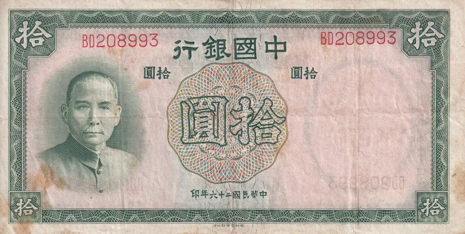 Home > > China 10 Yuan - Sun Yat-Sen - Bâtiment - 1937 - Serial DR - F+ - P.81