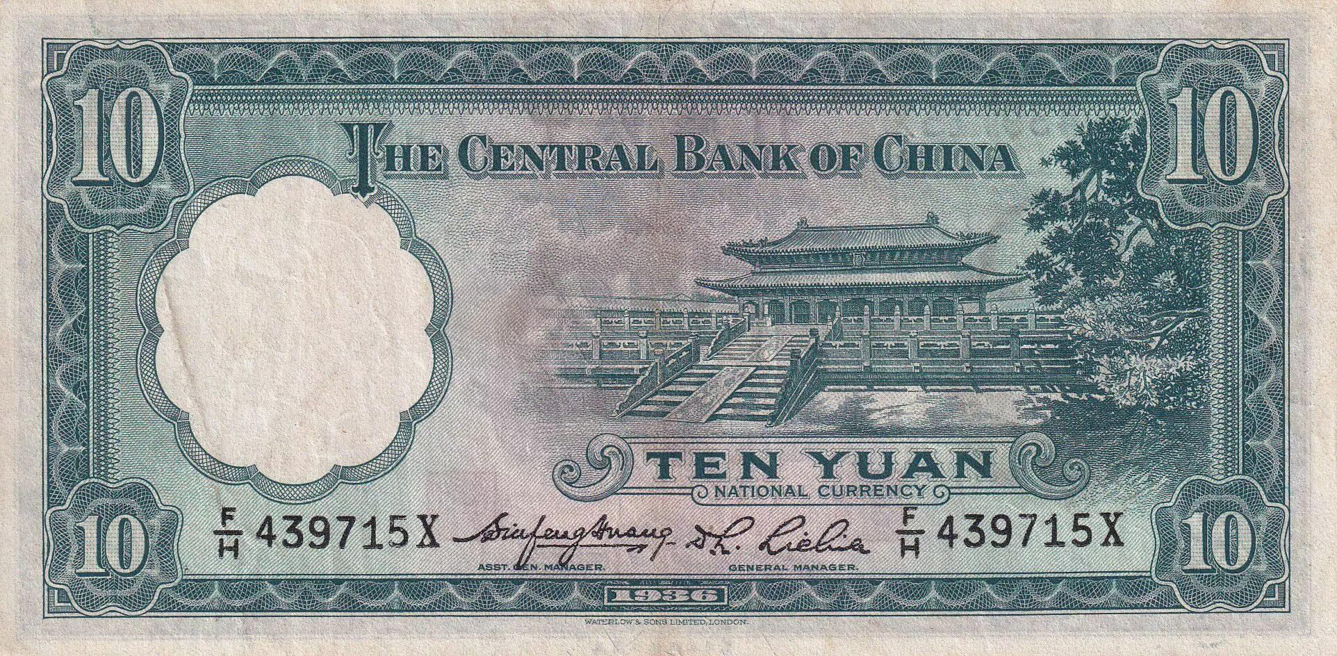 Banknote China 10 Yuan - Sun Yat-Sen - Forbidden city - 1936 - Serial FH - VF - P.218a
